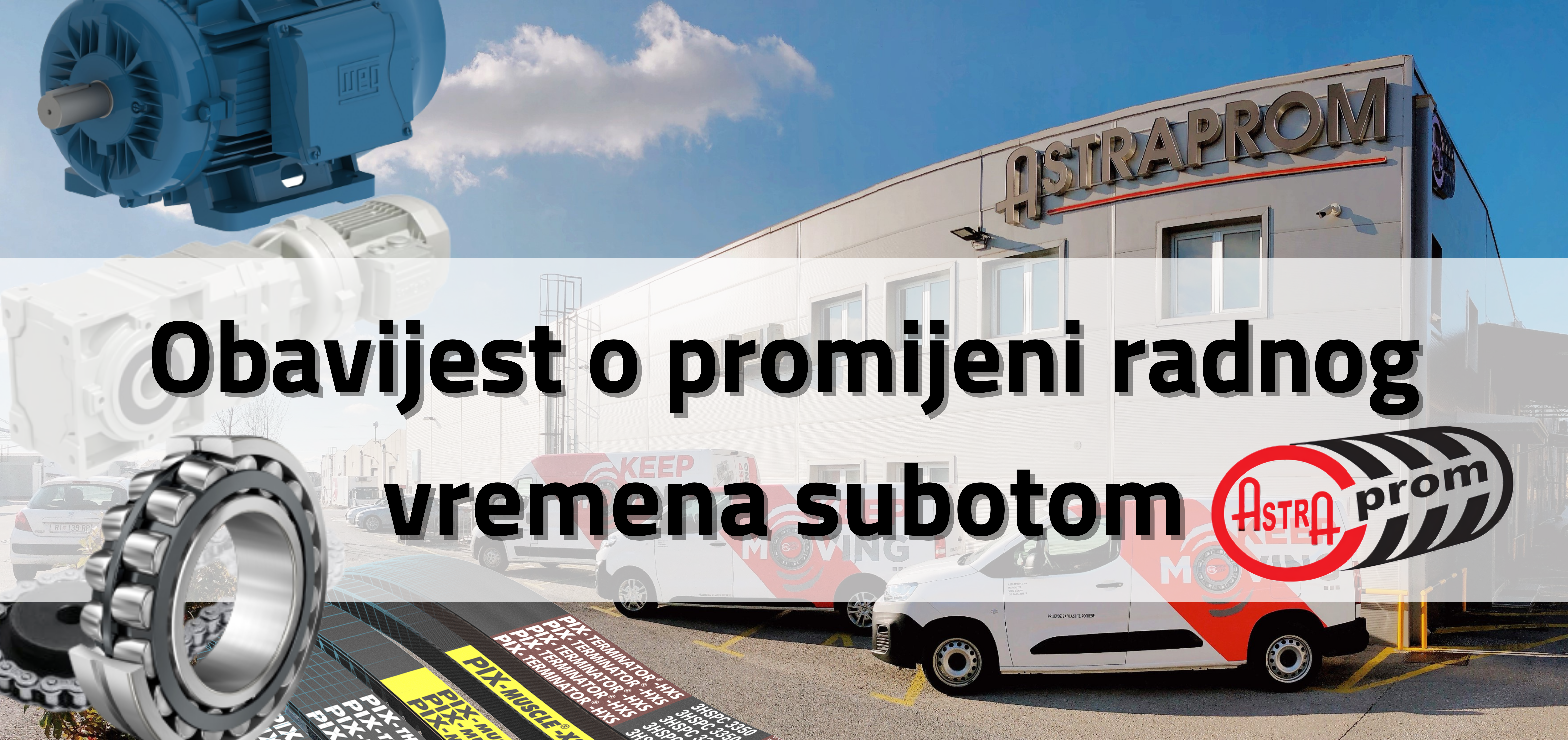 ovim putem želimo vas obavijestiti da se radno vrijeme subotom tvrtke Astraprom mijenja, te da je novo radno vrijeme subotom od 09:00h to 12:00h.