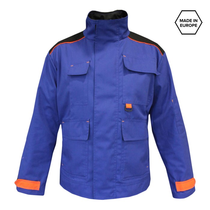 Materijal: 65% poliestersko vlakno, 35% pamuk, 245g/m 2 Održavanje: industrijsko pranje na 75 °C, pranje u perilici rublja 60°C Radna jakna izrađena je od Tencate Tecawork™ tkanine koja je pogodna za indusrijsko pranje na 75 °C. Kopča se skrivenim patent zatvaračem i čičak trakom, ima klasični ovratnik i 5 funkcionalnih džepova. Rukavi se zatežu čičak trakom. Kroj je klasičan i dobro pristaje svima.